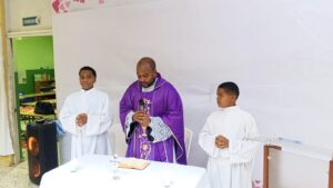 Ofician misa en el Centro Educativo General Benito Monción de Mao, sacerdote es egresado del plantel.