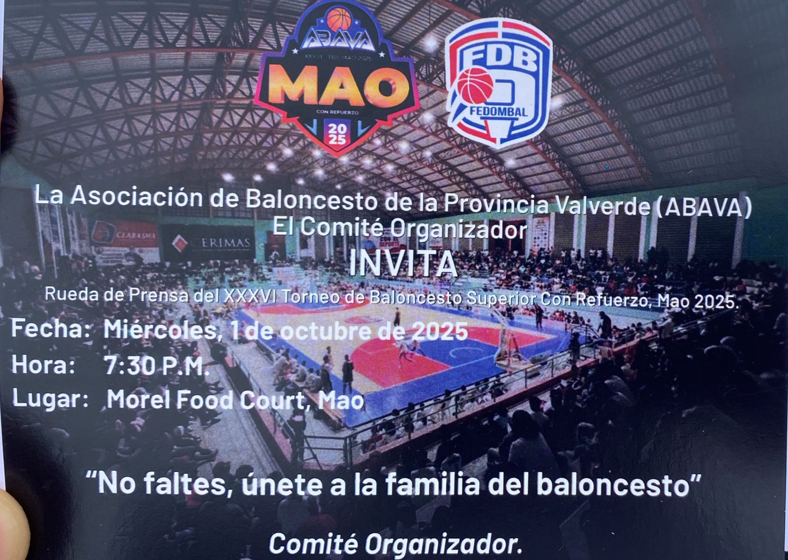 Mao, Valverde. La Asociación de Baloncesto de la Provincia Valverde y el Comité organizador del próximo Torneo de Baloncesto Superior con refuerzos, están invitando a una importante rueda de prensa para mañana, a las 7-30 PM, en el Morel Food Court, Mao.