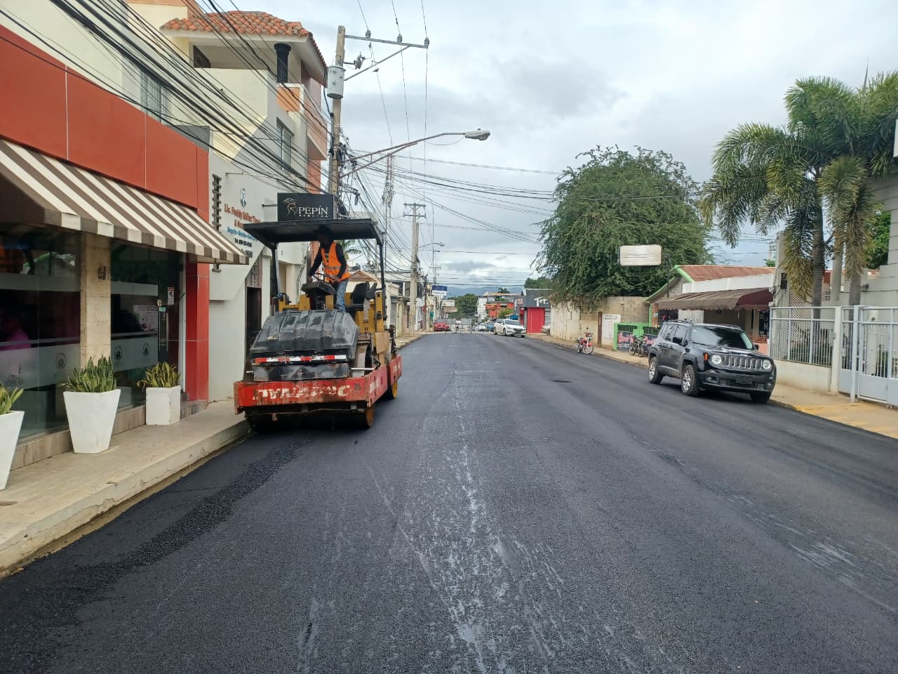 Varios vehículos pesados se mantiene trabajando hasta el día de hoy sábado con el asfaltado de esta calle y otras, ya que el gobierno y el propio presidente de la república, licenciado, Luis Abinader, tiene que presentar en su rendición de cuentas de la nación, la terminación de la primera etapa de la construcción del Alcantarillado Sanitario de esta localidad.