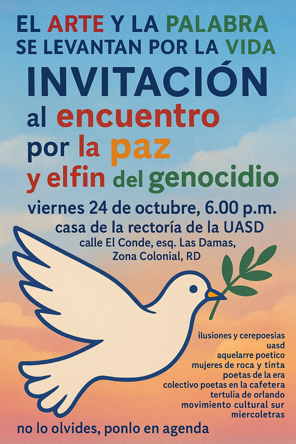 Santo Domingo. El arte y la palabra se levantan por la vida y el fin del genocidio, el viernes 24 de octubre a las 6:00 p.m. casa e la rectoría de la Universidad Autónoma de Santo Domingo, en la calle El Conde, esquina, Las Damas, zona Colonial.
