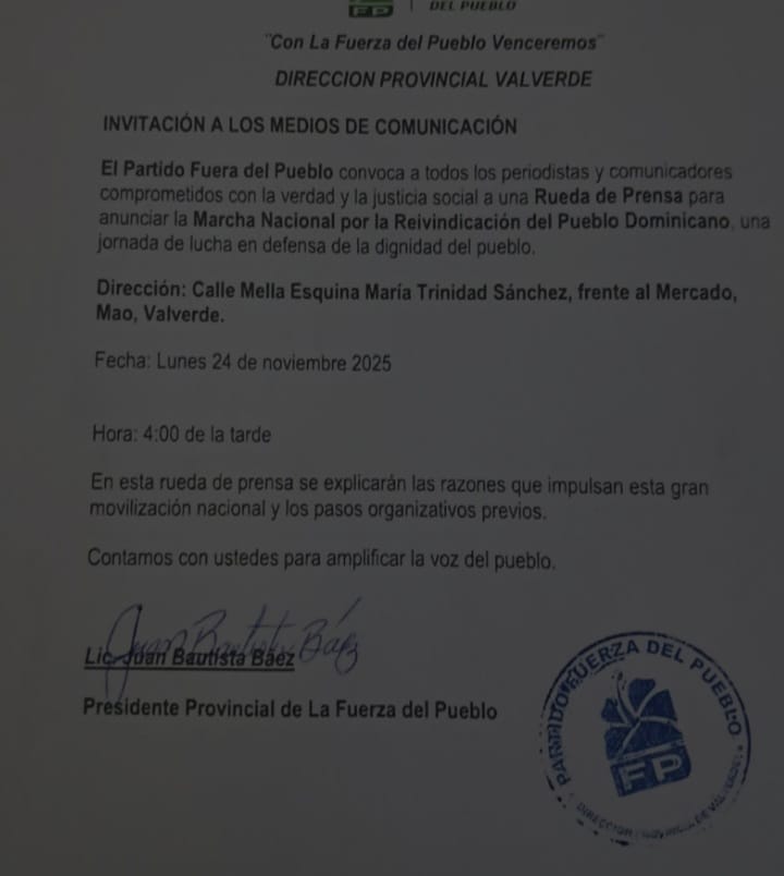 Mao, Valverde. El Comité Provincial del Partido Fuerza del Pueblo, en esta provincia, está convocando a una importante rueda de prensa, en esta ciudad de Mao, para dar a conocer el apoyo a la Marcha Nacional.