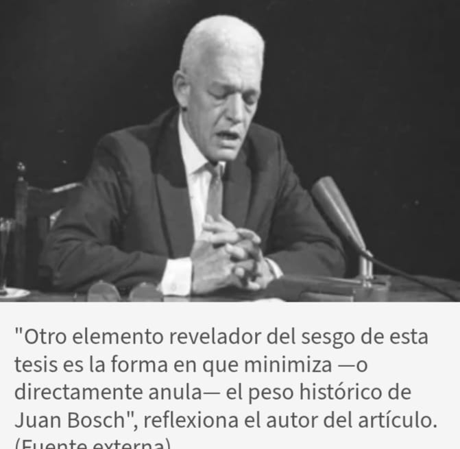 Otro elemento revelador del sesgo de esta tesis es la forma en que minimiza —o directamente anula— el peso histórico de Juan Bosch. Se afirma que Bosch habría sido inevitablemente marginado o expulsado. Pero esa afirmación ignora que Bosch era, ya en ese momento, uno de los principales referentes morales e intelectuales del antitrujillismo, con reconocimiento continental y con una concepción democrática profundamente arraigada.
