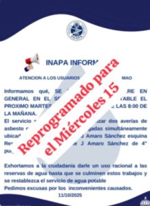 INAPA: Pospone suspensión de servicio del martes, para el miércoles 15 en Mao