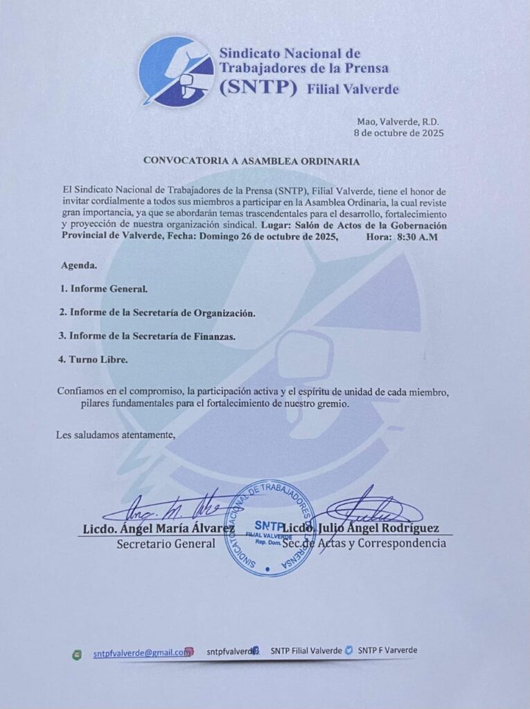 26-10-2025 El Sindicato Nacional de Trabajadores de la Prensa, filial Valverde, tiene programada para hoy...