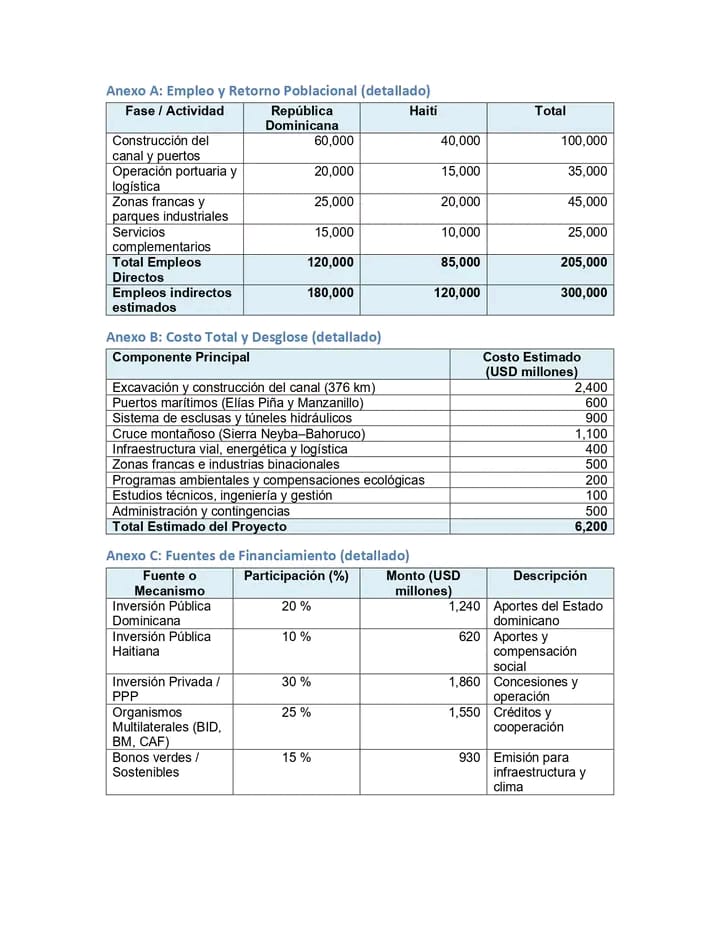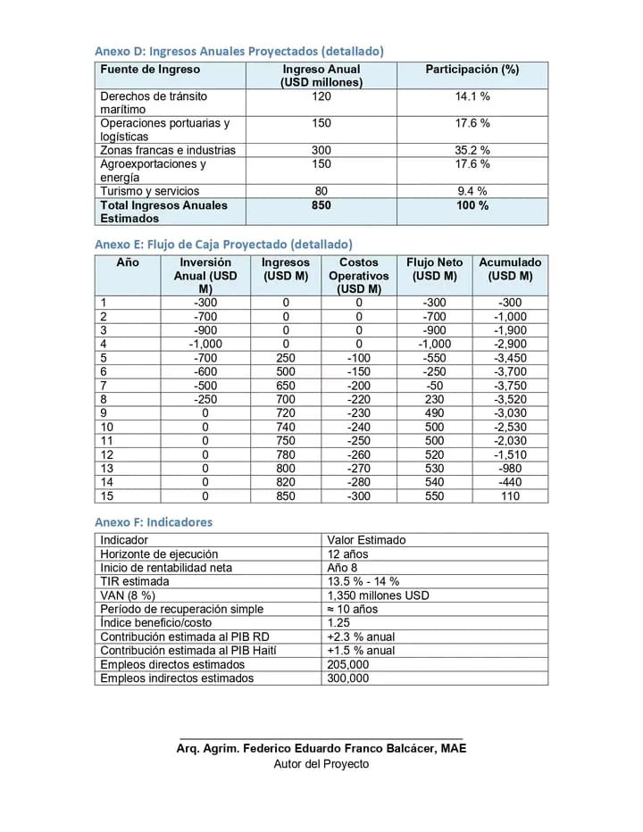 PROYECTO SOSTENIBLE DE DESARROLLO FRONTERIZO Y CANAL MARÍTIMO BILATERAL DOMINICO-HAITIANO Autor: Arq. Agrim. Federico Eduardo Franco Balcácer, MAE Celular 809-697-7363 1. Resumen Ejecutivo El proyecto plantea la construcción de un Canal Maritimo Bilateral entre República Dominicana y Haiti, con 376 km de longitud, con esclusas y tramos técnicos que atraviesan la Sierra de Neyba y la Sierra de Bahoruco. La vía maritima Caribe-Atlántico es el eje principal del proyecto; la desviación parcial del Río Yaque del Norte queda considerada como alternativa hidrica complementaria sujeta a estudios ambientales e hidrológicos. El objetivo es integrar económica y socialmente la frontera, crear zonas francas, generar empleo y reducir la migración irregular. 2. Objetivos del Proyecto Integrar el Cibao (Norte) con el Sur mediante un corredor maritimo interior. Crear desarrollo productivo en provincias fronterizas: Pedernales, Independencia, Elías Pina, Dajabón, Montecristi. Generar empleo formal y reducir presión migratoria sobre ciudades principales. Establecer zonas francas sostenibles y puertos logísticos (Elías Piña y Manzanillo). Garantizar sostenibilidad ambiental y gobernanza binacional del proyecto. 3. Descripción Técnica del Canal Longitud: 376 km Tipo: Canal marítimo con esclusas Ancho promedio: 80-120 m Profundidad promedio: 12-15 m Componentes: excavación y dragado, esclusas (8-10 principales), túneles hidráulicos en pasos montañosos, puertos en Elias Piña y Manzanillo, reservas y obras de mitigación ambiental. La vía maritima es prioritaria; la desviación del Yaque del Norte se presenta como opción complementaria. 4. Empleo y Retorno Poblacional Ver tablas en Word; se incluyen 205,000 empleos directos y 300,000 indirectos. Retorno poblacional estimado en 50,000 personas.